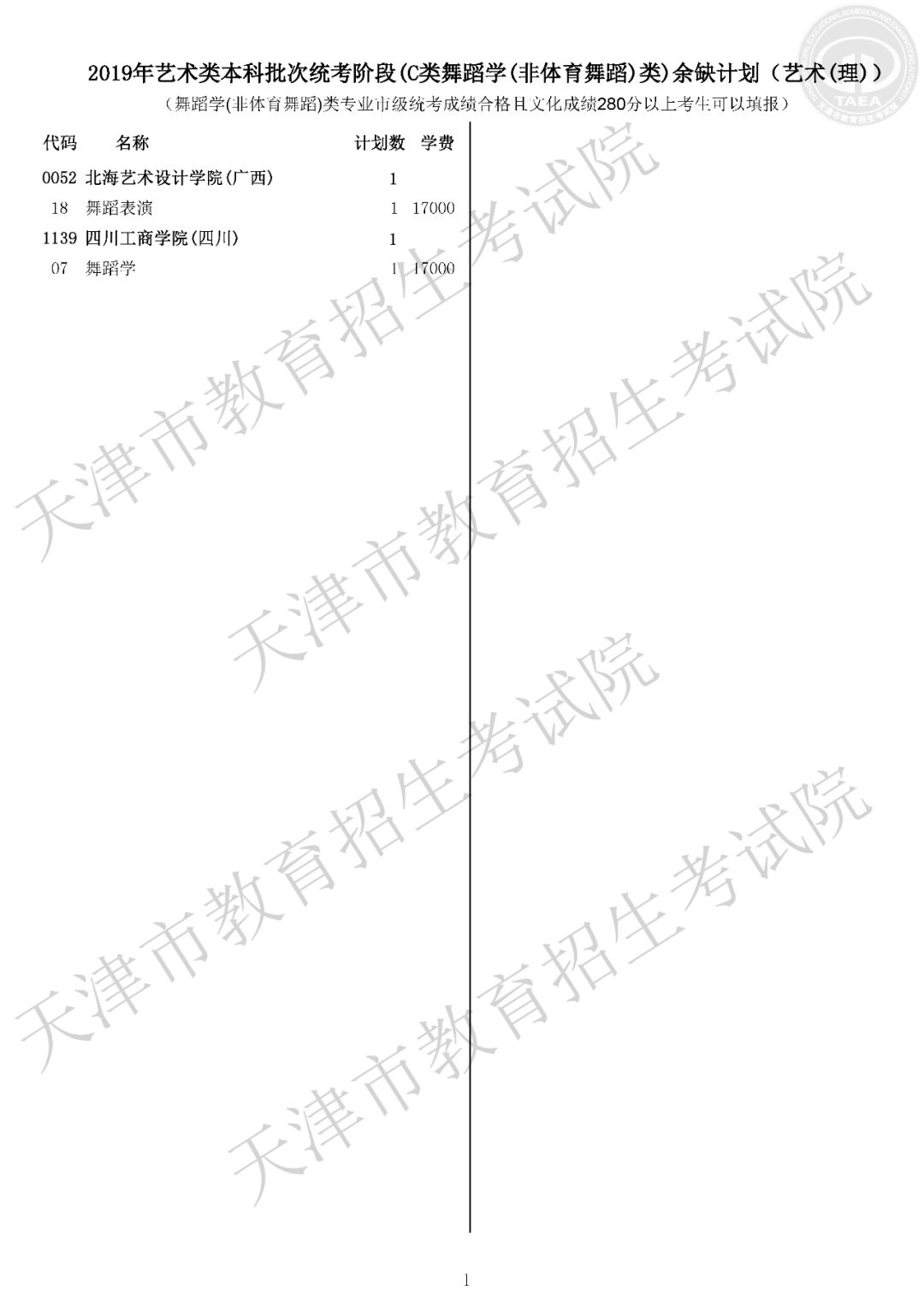 艺术类本科批次征询志愿院校余缺计划表