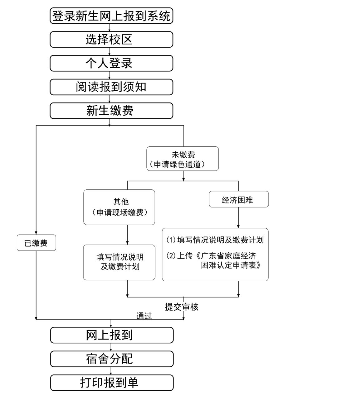 (1)家庭经济困难申请绿色通道缓交学费的学生,选择“经济困难”选项,填写情况说明及缴款计划并上传有个人承诺签名的《广东省家庭经济困难学生认定申请表》扫描件正反面,提交系统审核,3个工作日内反馈审核结果。如审核通过,则可进行后续网上报到操作;如未通过则按审核意见操作。