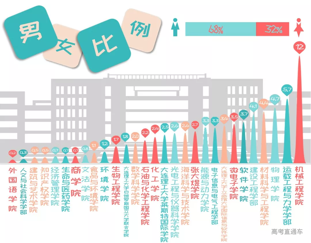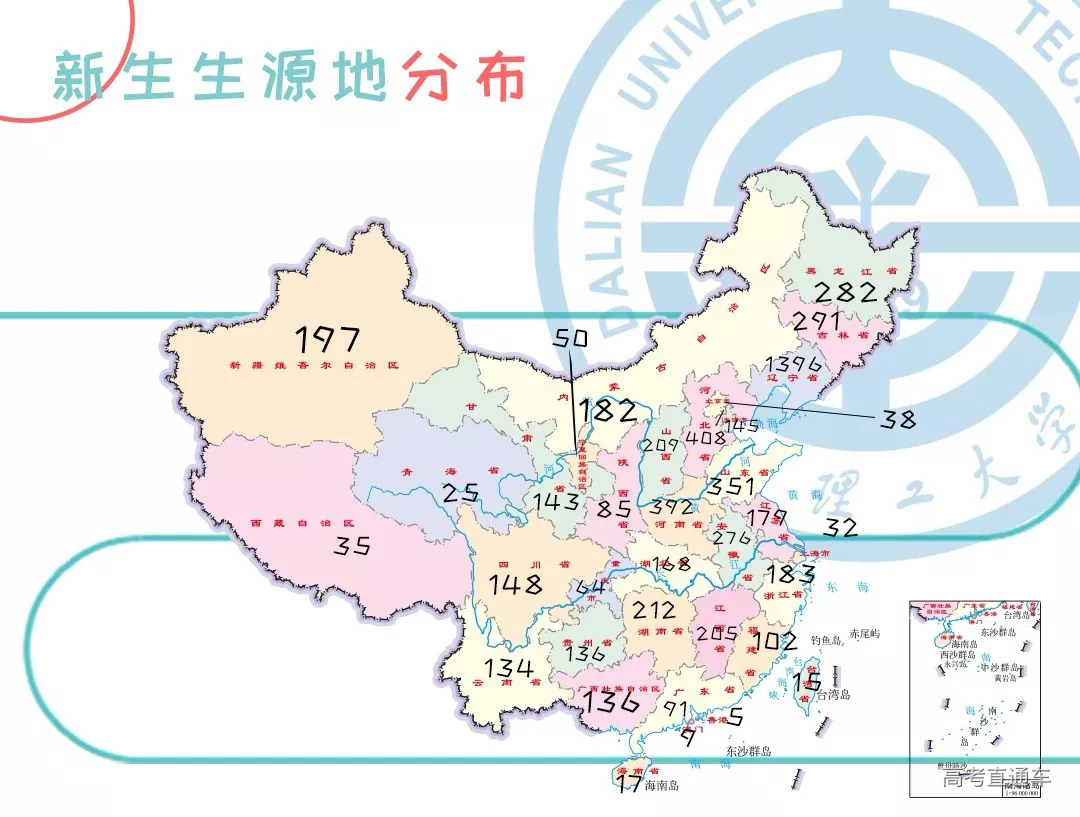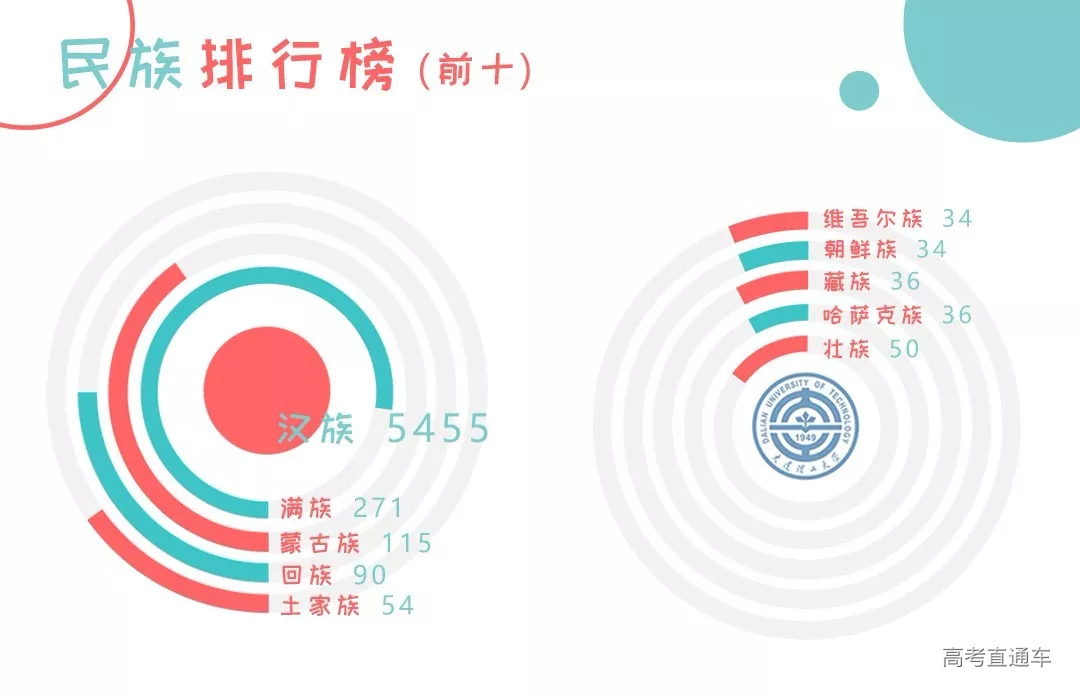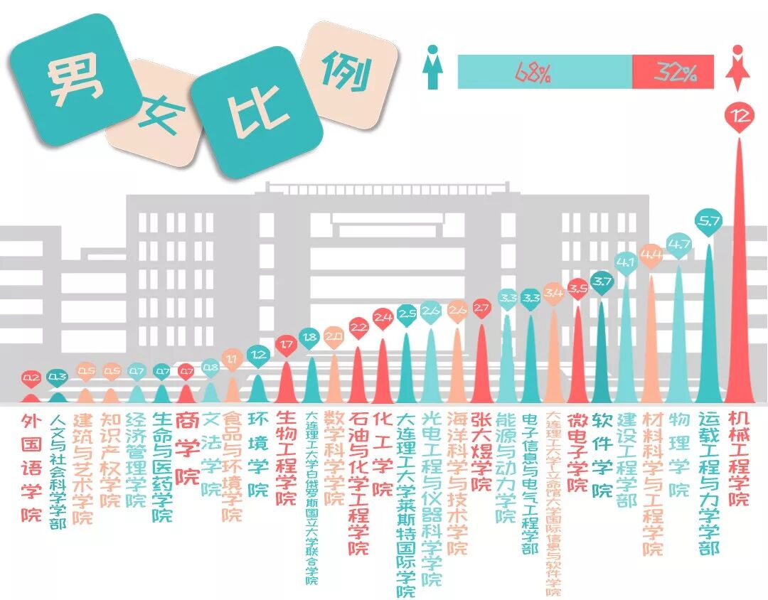 2019年,大工迎来了6341位小萌新,其中凌水主校区4186人,盘锦校区1300人,开发区校区855人。 整体上仍旧呈现出男生多于女生的态势,男生4316人,占录取总人数68%,女生2025人,占录取总人数32%,男女比例接近2:1,早就不是传说中的7:1啦! 各个学部(院)的男女新生比例也各有特点,恭喜机械工程学院以12:1的男女比例拔得头筹,外国语学院比例为1:5.4,解锁成就——“男女比最小学院”,恭喜你们! 从录取人数来看,化工学院人数最多,共加入了663位萌新;加入人数最少的学院是知识产权学院,为41位。 不论人数多少,求学之路,不忘初衷,朝着我们美丽的梦想勇敢前行。 今年萌新们的年龄组成是什么样的呢?从年份上看,2001年出生的小萌新成为主力军,共4067位。年龄最小的萌新仅14岁!最大的为30岁!两人相差5643天! 在大工,不论你的年龄大与小,只要你有对知识的向往,探索真理的激情,就让我们带着向往,在大工,不负韶华。 2001年3月2日,24位准Duters出生啦,荣获“产生Duters最多日”,今年一共有20位小萌新和大工生日4月15日同一天!独一无二的你们,与独一无二的大工结缘,多么奇妙的缘分,快来看看有没有和你的生日一样的吧! 在今年录取的萌新的星座中,稳定踏实的金牛座数量最多,共1112人,灵动活泼的双子座人数最少,有250人,无论你是哪个星座,大工都是你的量身定制! 大工姓氏排行榜来啦!大工版百家姓由你们书写,“王李张刘,陈杨赵孙,周吴马”这些姓氏都过百啦!今年的人数之最仍由“王”姓领跑,“李”姓紧随其后。同时我们出现了四个王一帆同学,四个刘畅同学! 名“字”方面,“宇”字被用在了289位萌新身上,男生气宇轩昂、博古通今;女生冰雪聪明,温文尔雅! 今年本科新生中汉族学生占新生总数86%左右,少数民族中满族人数最多,占新生总数的4.3%,除此之外,少数民族预科班招入81名,预升本81名,每个民族都有自己独一无二的地方,要相互尊重风俗习惯和独特文化哦。 从录取省份来看,辽宁省具有主场优势,本省的萌新共有1396人。面朝大海,春暖花开的大工,也吸引着全国各地的同学们,从最南到最北,从最东到最西,全国各地的小鲜肉聚集大工! 今年贡献生源最多的十所中学中。大连育明高级中学荣登榜首,为69人,衡水志臻中学荣获“唯一上榜的外省学校”,快来看看这些学校中,有你的母校吗? 看了以上信息,小编不禁感叹,新生也太棒了吧!真的是德智体美劳全面发展,琴棋书画样样精通,球类、琴类、书法、绘画、唱歌……不负大工是“最文艺的理工院校”的盛名!期待着你们诗朗、峰岚、运动会、十佳歌手、悦动杯的表现哟!