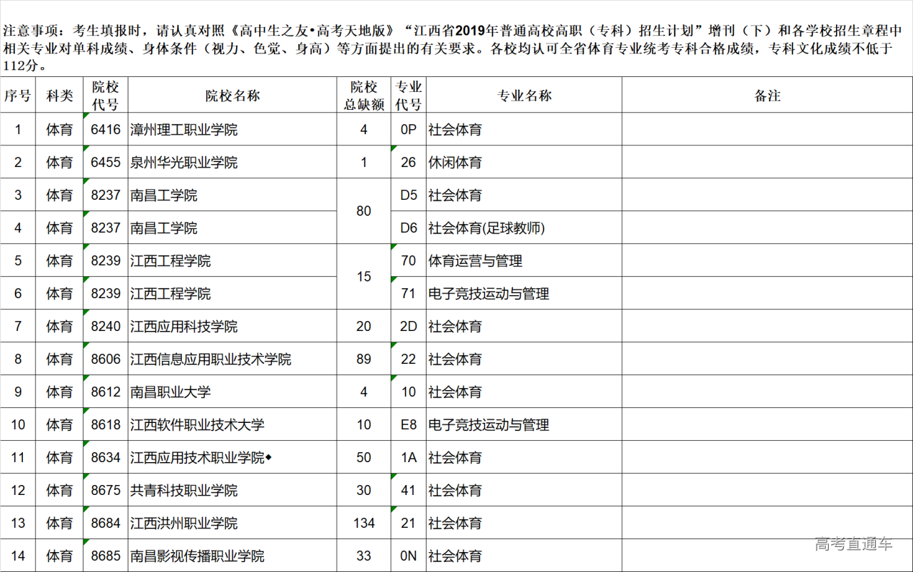 2019江西高考高职(专科)体育类平行志愿缺额院校及专业统计表