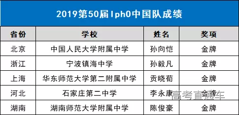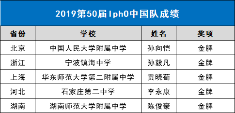 7月15日,2019年第50届国际物理奥林匹克竞赛(IPhO)成绩公布,中国队五名队员全部获得金牌!中国队总成绩第一名!包揽所有个人单项第一!