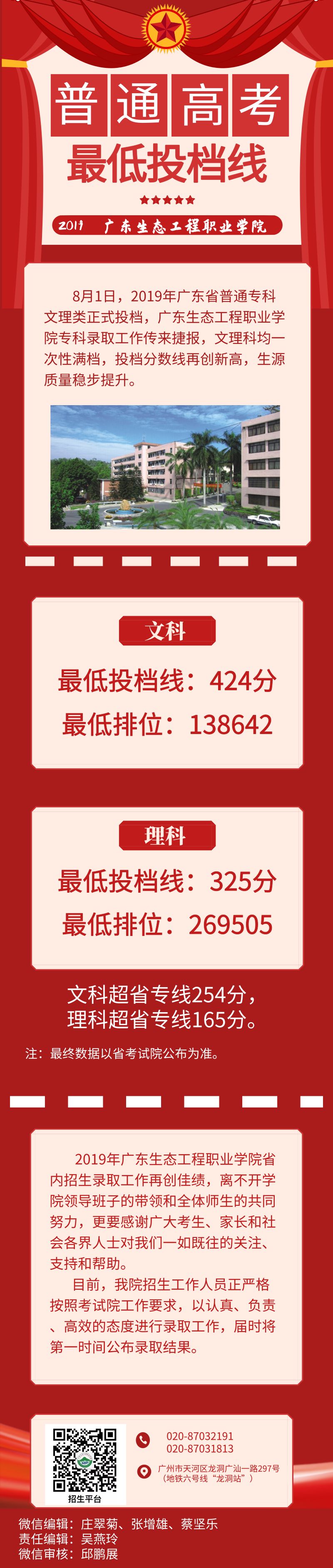 广东生态工程职业学院2019年普通高考广东省文、理最低投档线公布!