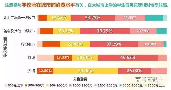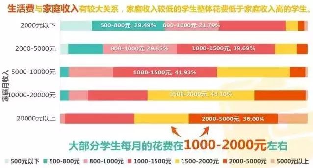 从网上看见一个调查,从图中数据就可以看出但即使是家庭收入在2000元以下的最低一档,生活费的中位数也在800-1000元左右。