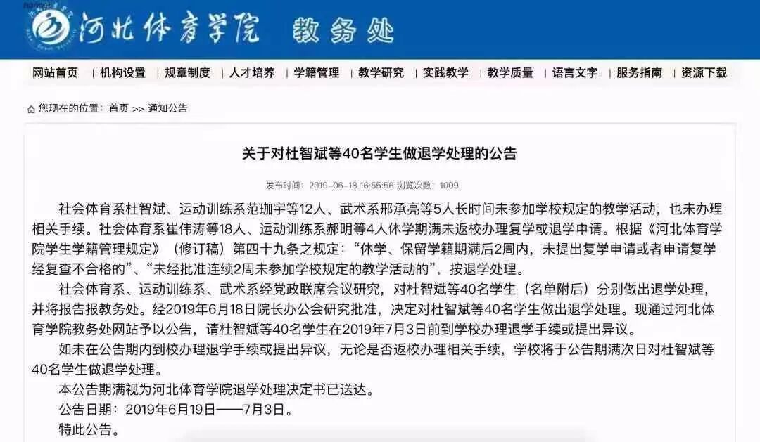6月18日,河北体育学院40名学生因长期旷课且未办理任何手续,而被退学。