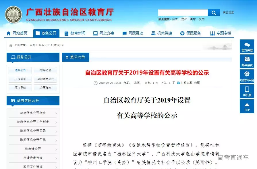 9月29日,广西壮族自治区教育厅公布了一份《自治区教育厅关于2019年设置有关高等学校的公示》。