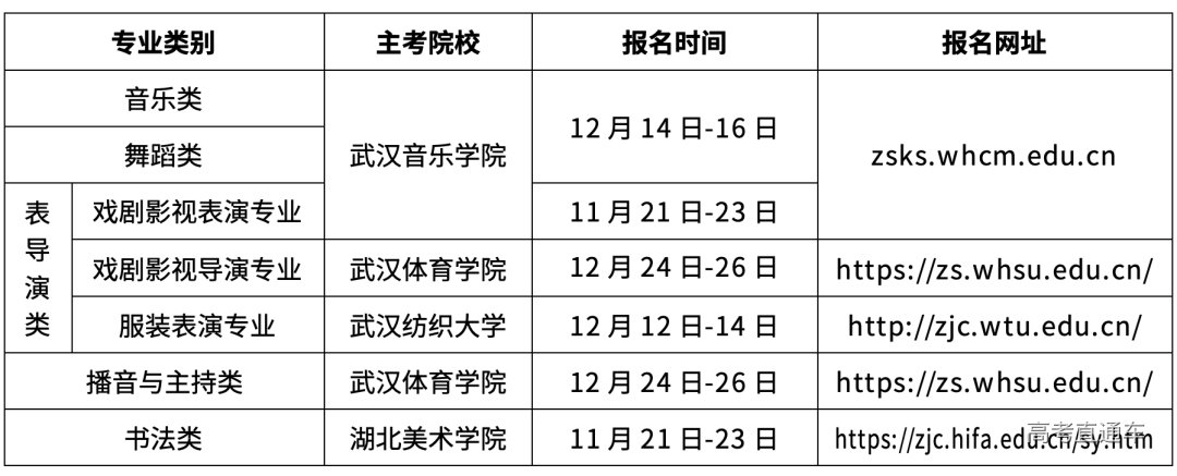 音乐类、舞蹈类和戏剧影视表演专业统考考务组织与评分由武汉音乐学院负责实施;戏剧影视导演专业和播音与主持类统考考务组织与评分由武汉体育学院负责实施;服装表演专业统考考务组织与评分由武汉纺织大学负责实施;书法类考务组织与评分由湖北美术学院负责实施。戏曲类省际联考考试组织和评分工作另行通知。