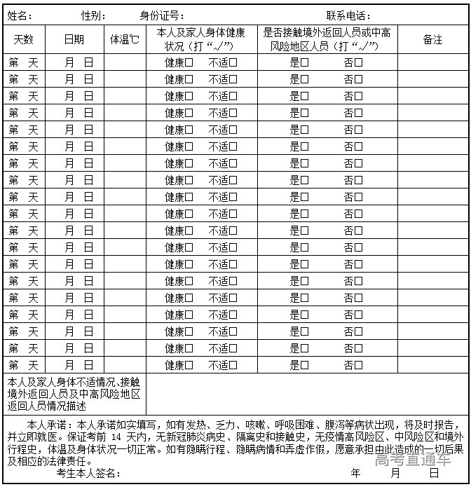 2022年青海省艺术类专业省级统考考生安全考试承诺书及身体健康状况监测表
