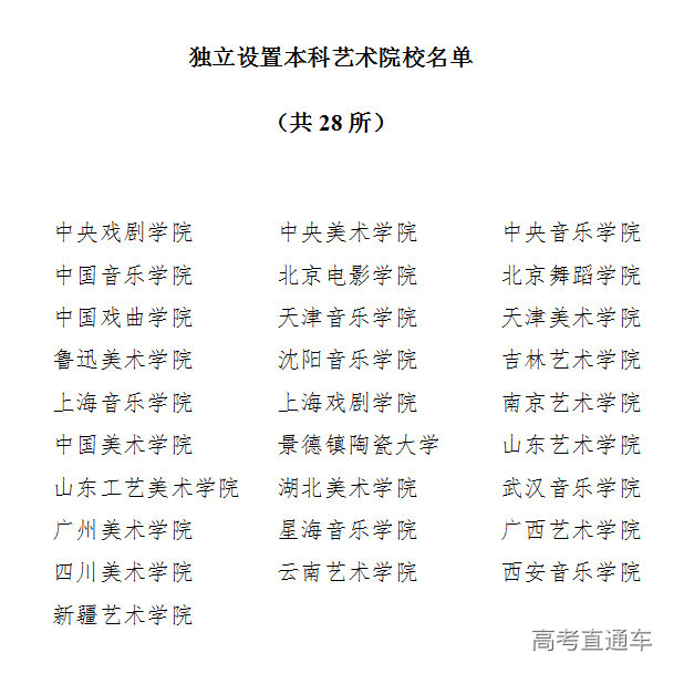 清华大学、中国传媒大学、中央民族大学、东华大学、江南大学、北京服装学院、北京印刷学院(限视觉传达设计专业、数字媒体艺术、动画、绘画等4个专业)、天津工业大学、上海大学、哈尔滨音乐学院、上海视觉艺术学院、苏州大学(限视觉传达设计、环境设计、产品设计、服装与服饰设计等4个专业)、浙江传媒学院(限播音与主持艺术、广播电视编导、摄影、录音艺术、影视摄影与制作等5个专业)、浙江理工大学(限艺术设计本科专业)、内蒙古大学(限音乐表演、表演、音乐学3个本科专业)、武汉设计工程学院成龙影视传媒学院(限表演、播音与主持艺术、戏剧影视美术设计等3个本科专业)、浙江音乐学院(仅限音乐学、音乐表演、作曲与作曲技术理论、舞蹈表演、舞蹈学、舞蹈编导、表演、艺术与科技等8个本科专业)及河北美术学院(限书法学、雕塑、艺术与科技、动画、数字媒体艺术、广播电视编导、服装与服饰设计、戏剧影视美术设计、影视摄影与制作、表演、播音与主持艺术等11个专业)。
