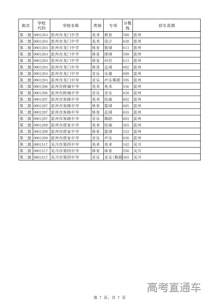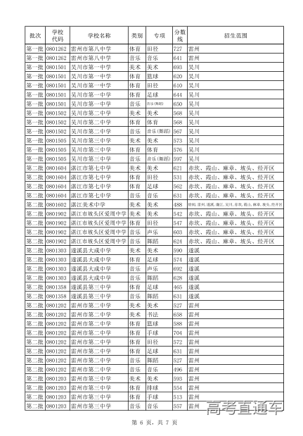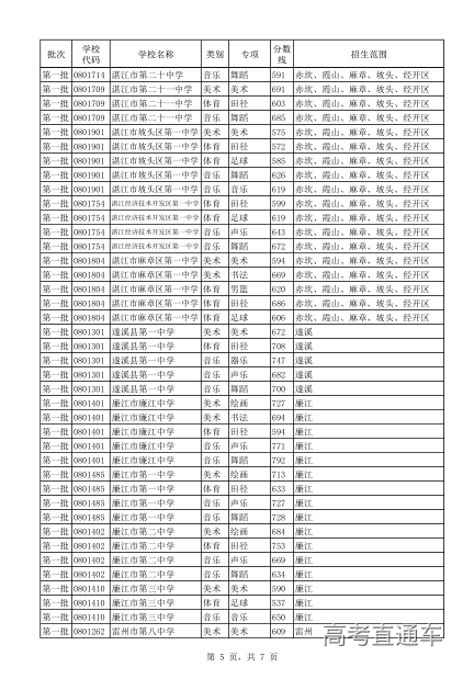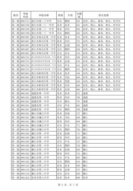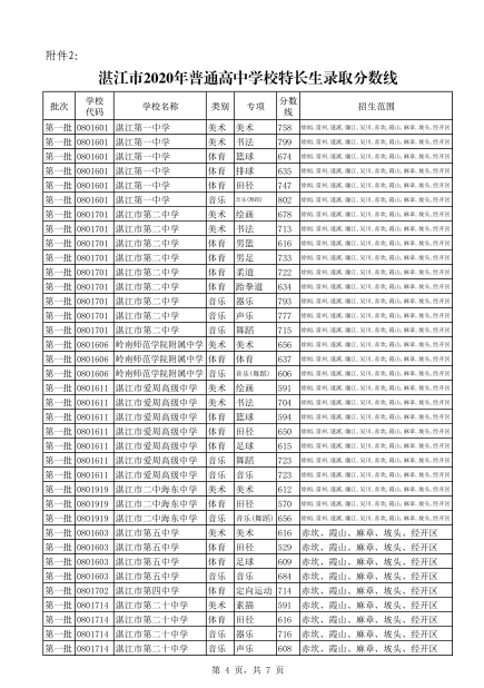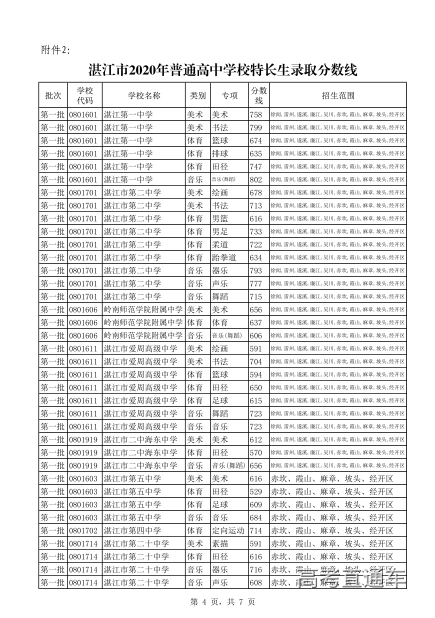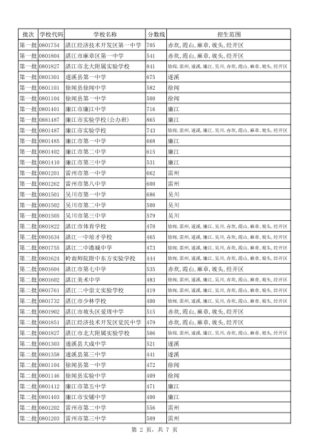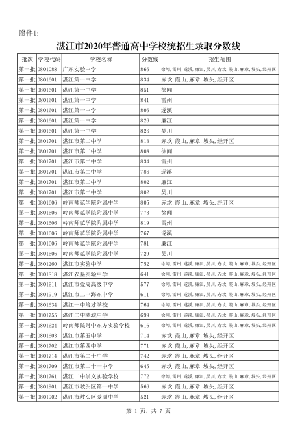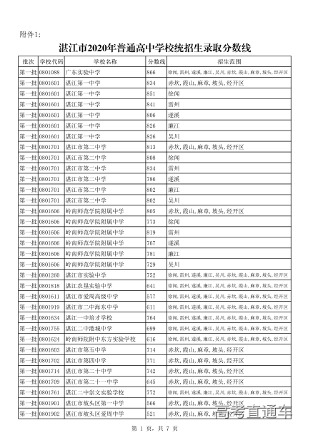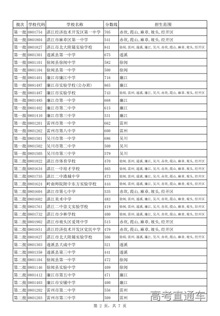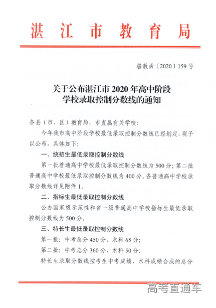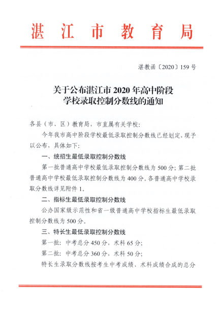 2020年湛江市高中阶段学校录取控制分数线已划定。其中,第一批普通高中学校最低录取控制分数线为500分;公办国家级示范性和省一级普通高中学校指标生最低录取控制分数线为500分;第二批普通高中学校最低录取控制分数线为400分。