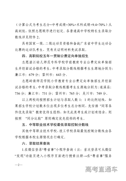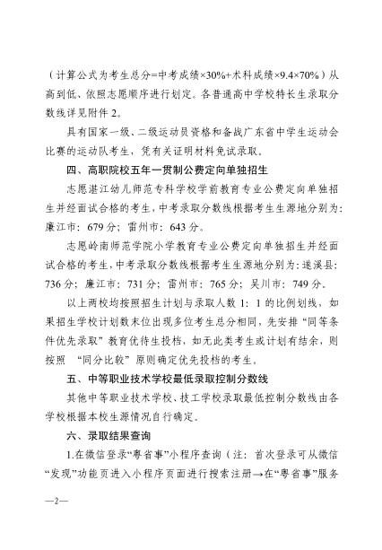 第一批普通高中特长生最低录取控制分数线为450分,术科65分;第二批为360分,术科为50分。特长生录取分数线按考生中考成绩、术科成绩合成的总分(计算公式为考生总分=中考成绩×30%+术科成绩×9.4×70%)从高到低、依照志愿顺序进行划定。具有国家一级、二级运动员资格和备战广东省中学生运动会比赛的运动队考生,凭有关证明材料免试录取。