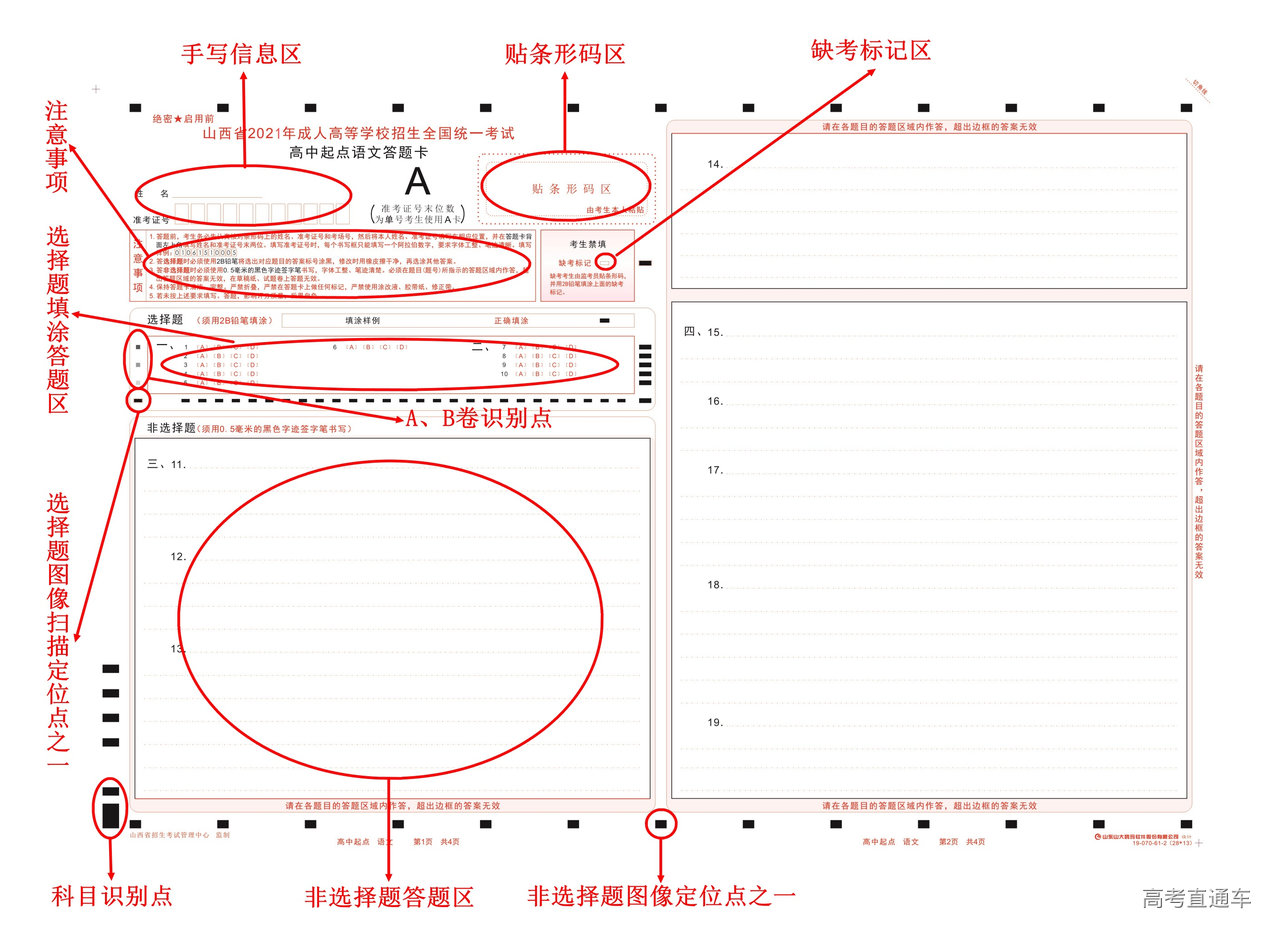 答题卡的设计格式:答题卡设计采用选择题和非选择一体化设计,英语、医学综合科目采用A4答题卡,其他科目采用A3答题卡。