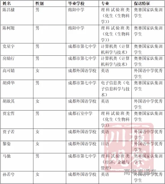 新闻多一点: 2020年四川102名学生保送进全国20所高校 近日,教育部公布了2020年各院校保送生拟录取名单。51所全国高校公布了拟录取学生人数、学生保送情况、拟录取专业专业等信息。 根据统计,四川今年共有102名学生被保送进全国20所高校。这102名学生主要来自4所高中: 成都外国语学校:共保送86人 成都七中:共保送11人 绵阳中学:共保送4人 石室中学:共保送1人 成外作为四川唯一具有保送资格的外国语学校,2020年共计保送外语类学生85人。 五大学科竞赛类的保送生,均是进入国家集训队的成员,共计保送17人。其中成都七中11人,绵中4人,石室中学和成外各1人。 恭喜被保送的同学们! 也预祝明天参加考试的考生, 金榜题名!