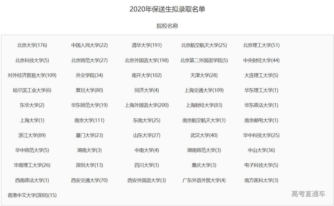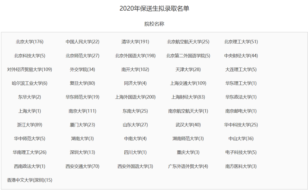 公示信息显示,今年,清华大学拟录取保送生191人,含四川考生20人;北京大学拟录取保送生176人,含四川考生12人。