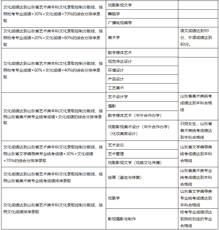 ●专科录取办法我校所有专科专业不组织专业考试,按山东省教育招生考试院公布的录取原则进行录取。其中美术类专业按照综合分数录取(综合分数折算办法按照山东省教育招生考试院规定执行);其它专业认可相同或相近本科专业校考合格成绩,按照文化成绩录取。