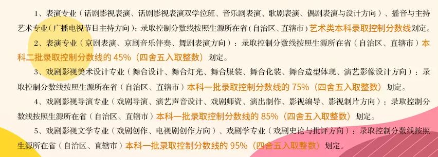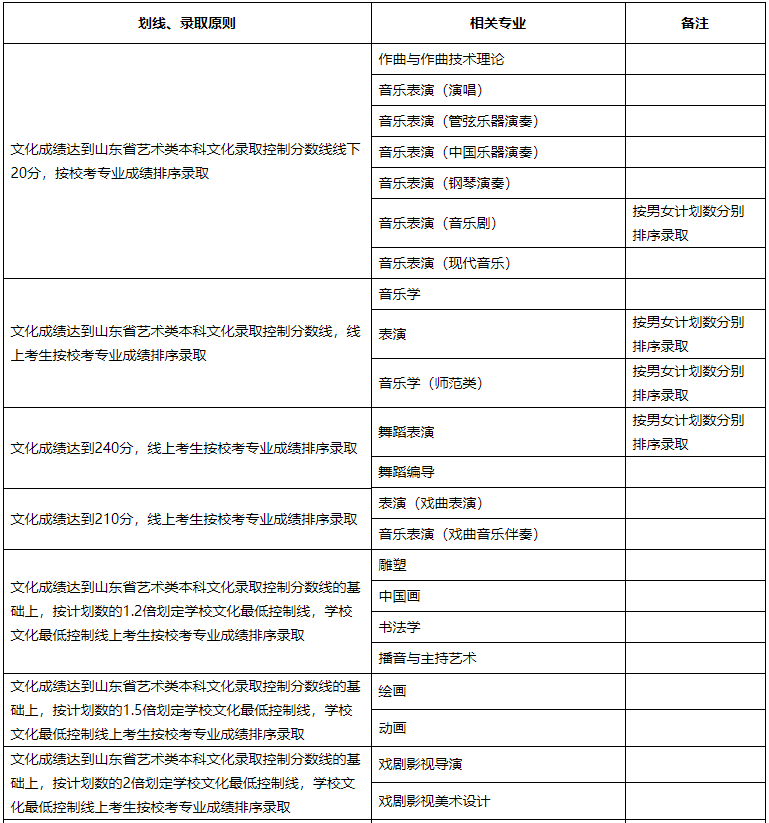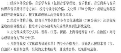 3.美术学、艺术学理论、建筑学、艺术与设计管理专业录取文化课分数线由专业合格考生按文化课相对成绩排序产生,不低于生源省份普通本科批次或普通本科第二批次录取控制分数线。