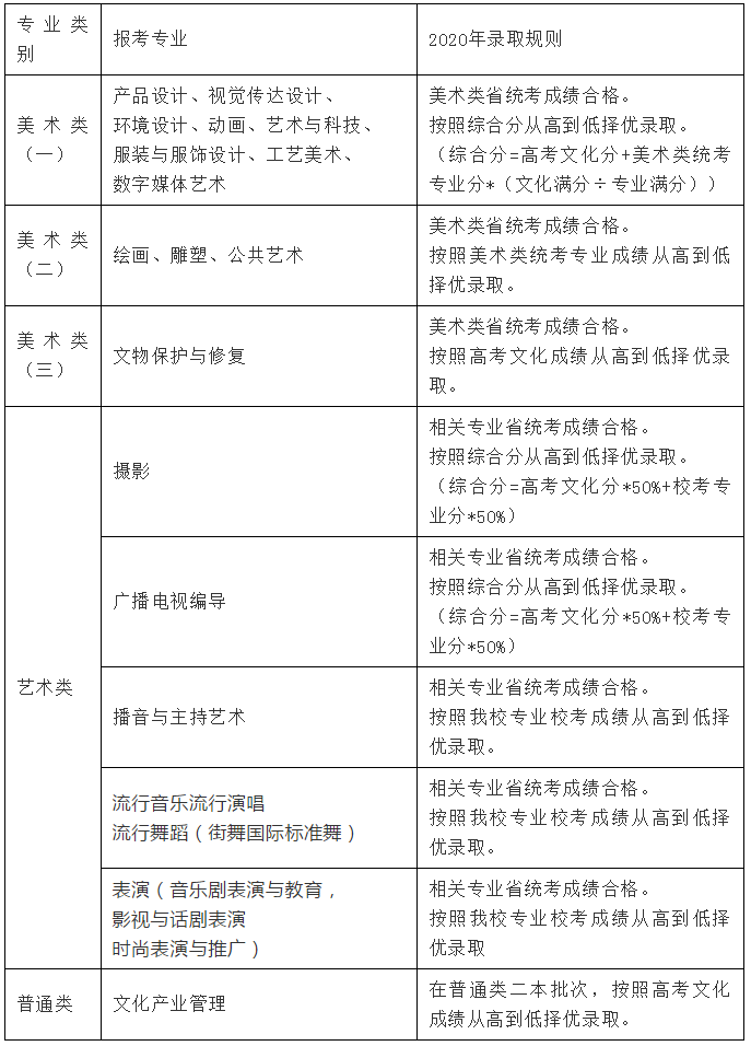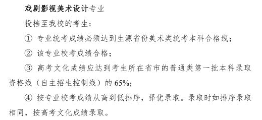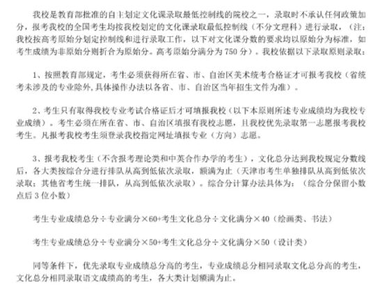 (五)我校所有专业不区分文理科按统一标准录取。工业设计专业按普通类高考投档成绩择优录取。学校自主命题的专业按专业考试分数合格,且高考文化课成绩(不分省份,按高考文化课成绩满分750分计算,满分不是750分的折算成750分)达到最低分数线后,按以下录取规则择优录取: