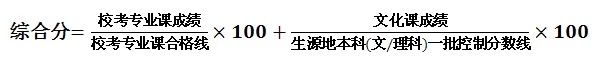 综合分 = 专业成绩总分÷专业成绩满分×60 +高考文化课成绩总分÷高考文化课满分×40