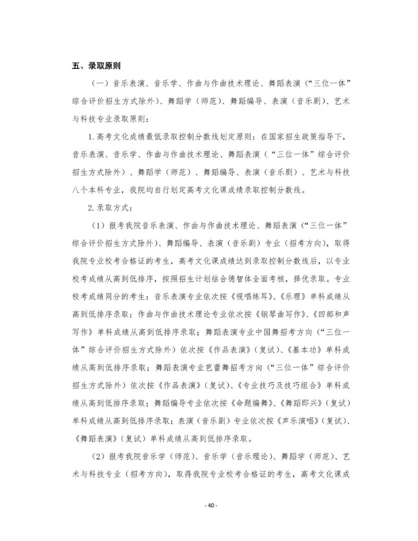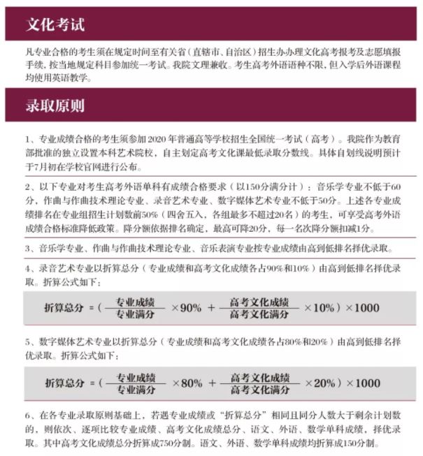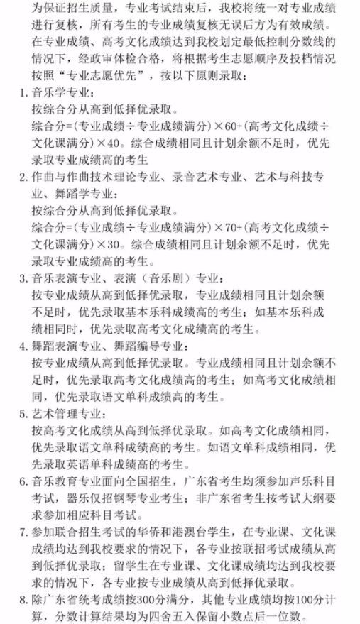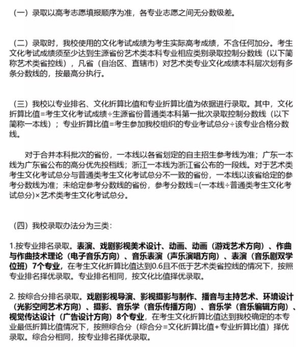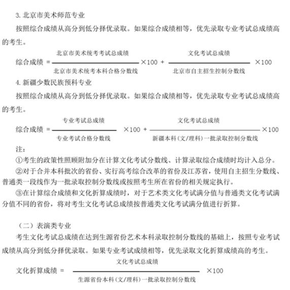 (2)其他专业(类):以专业成绩和高考文化课成绩折算综合分,按综合分排名从高分到低分顺序录取。录取时,当综合分排名并列时,专业课成绩高者优先录取。