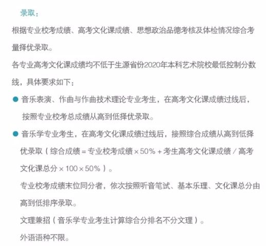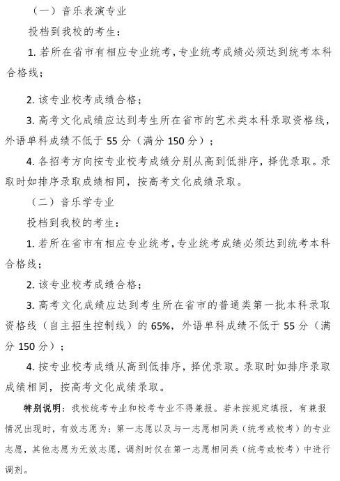 贯彻德、智、体、美、劳全面考核择优录取的原则,在考生政治思想品德考核和体检合格的情况下,不实行平行志愿投档的省份,考生外语单科成绩95分以上(含),按专业分和文化折算分5:5比例的综合分排序择优录取,综合分并列的按专业成绩从高到低择优录取;实行平行志愿投档的省份,外语单科成绩95分以上(含),按各省相应统考类别(专业)平行志愿投档规则进行择优录取。只招收有该专业志愿的考生,不录取服从专业调剂志愿的考生。