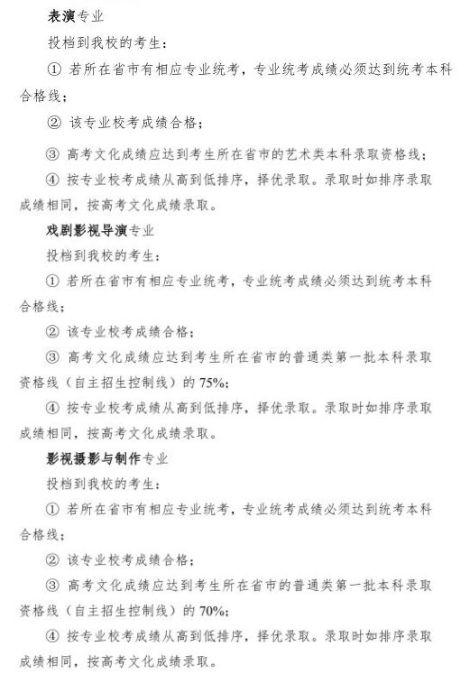 1.理论类专业:专业考试合格,文化成绩总分达到我校划定的分数线,按高考文化成绩从高到低择优录取(单科成绩不作要求)。