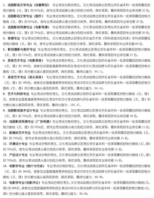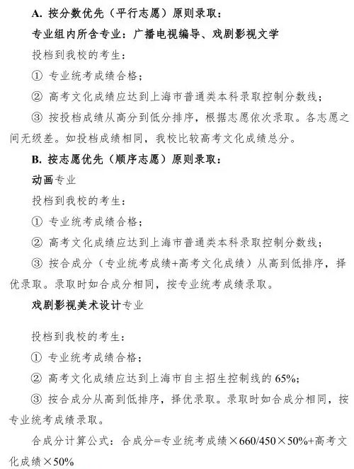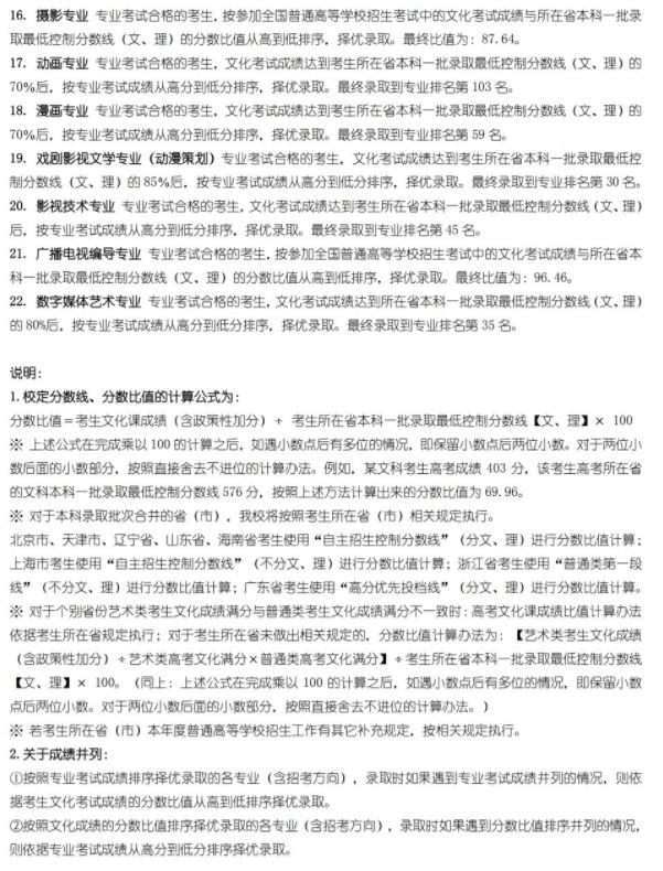 动画、动画(漫插画)、设计学类(含视觉传达设计、产品设计2个专业)、服装与服饰设计(中外合作办学)、戏剧影视美术设计:综合分=专业分×50%+文化折算分×50%。