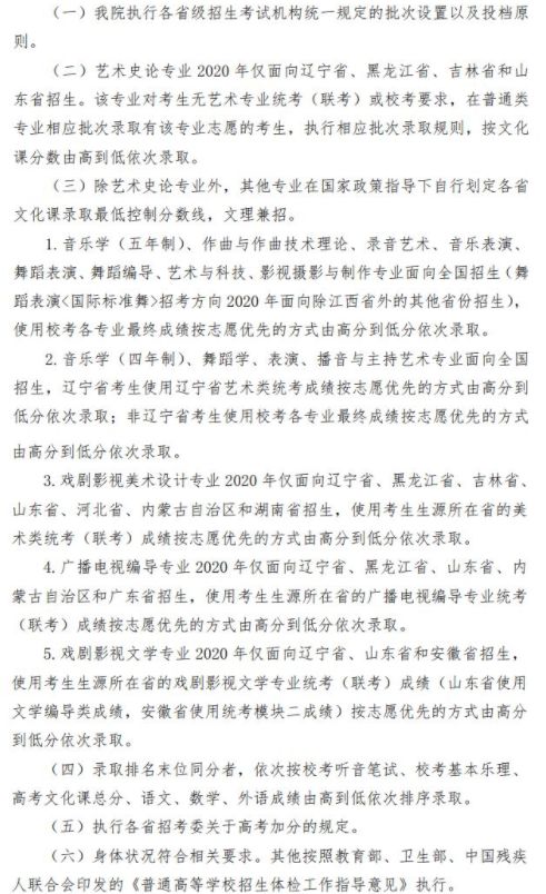 1、报考我院的考生,文化课总分达到我院最低控制线后,依据考生填报的高考专业志愿,按照“分数优先、平行志愿”规则,各类别根据考生专业课考试和高考文化课考试的综合分数,文理科考生从高到低统一排名依次录取(辽宁省考生统一排名,外省考生统一排名)。