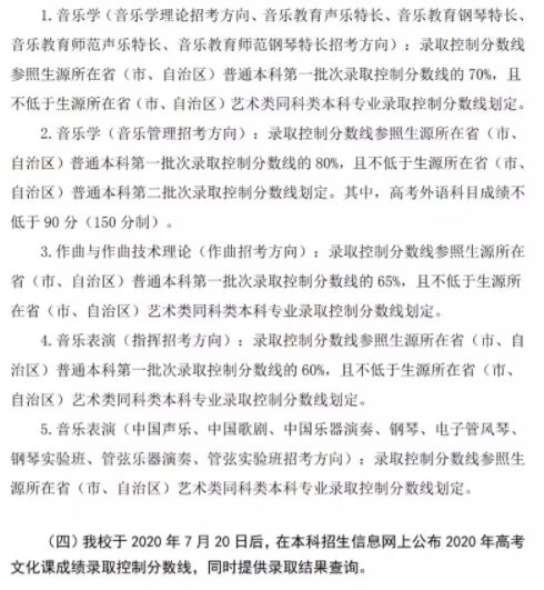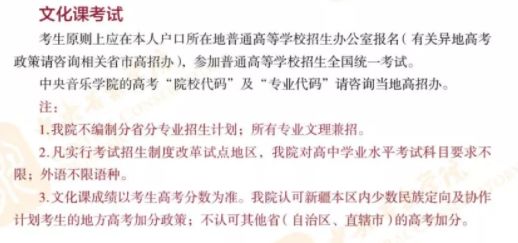4.考生的视唱练耳成绩不计入综合成绩,但必须达到合格要求。音乐表演(少数民族乐器)方向考生的视唱练耳成绩仅作参考,但五音不全者,不予录取。