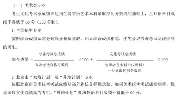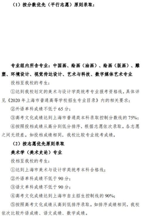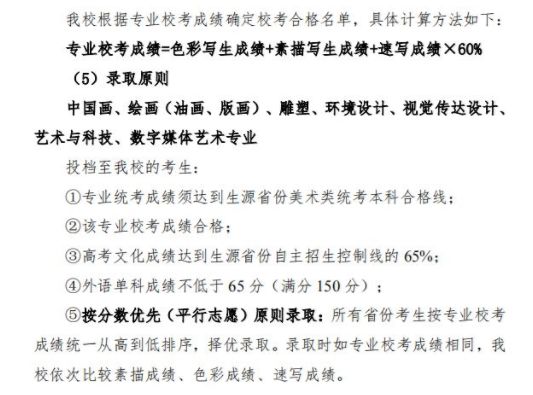 美术学类、戏剧与影视学类录取文化课总分高的考生;如文化课总分并列,按照语文、数学、外语分数优先录取。设计学类、书法学专业、中外合作办学项目、美术学专业、艺术设计学专业录取专业课总分高的考生;如专业课总分并列,按照语文、数学、外语分数优先录取。