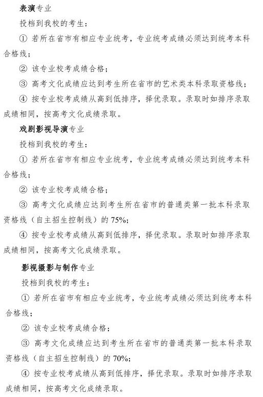 (一)学校属于专业考试自主命题的艺术院校。根据教育部规定,考生的报考专业如为所在省统考范围内的专业,应先参加所在省统考,省统考合格后,参加学校自主命题的专业考试成绩才有效。请考生咨询所在省份所报专业的统考合格要求,我校将按照考生所在省的统考专业合格要求执行。