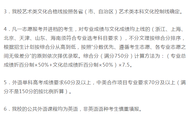 2.造型类、设计类、书法类专业:专业考试合格,文化课成绩总分达到我校划定的分数线,按综合分排名,择优录取(单科成绩不作要求)。综合分计算方法:高考文化成绩÷高考文化满分×30+专业成绩÷300×70。
