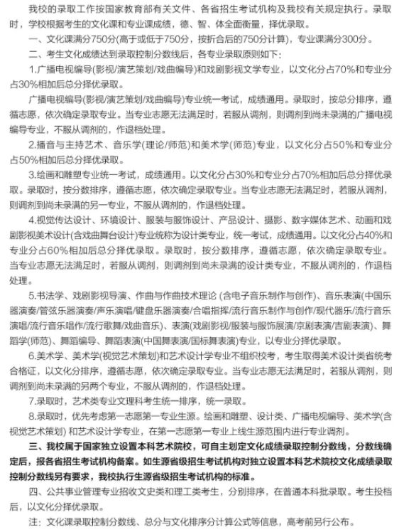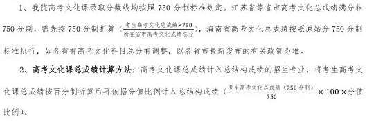 (1)第一志愿报考我校,文理兼招,依据综合成绩统一划定录取分数线。综合成绩=(专业校考成绩×40%+文化成绩×60%)×2,文化成绩和专业校考成绩满分均按750分计算。