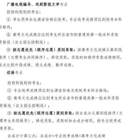 4.相关专业综合分计算方式(专业满分以100分计):播音与主持艺术、播音与主持艺术(影视配音)、播音与主持艺术(礼仪文化)、播音与主持艺术(双语播音):综合分=专业分×40%+文化折算分×60%。