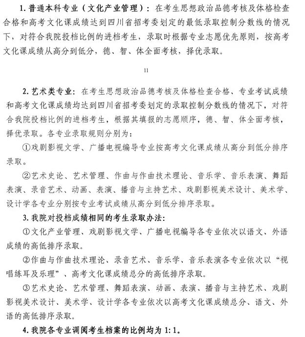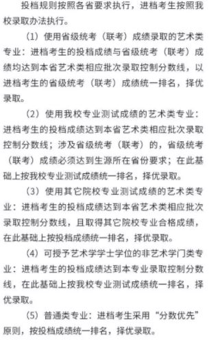 贯彻德、智、体、美、劳全面考核择优录取的原则,在考生政治思想品德考核和体检合格的情况下,不实行平行志愿投档的省份按专业分和文化折算分5:5比例的综合分排序择优录取,综合分并列的按专业成绩从高到低择优录取。实行平行志愿投档的省份按各省相应统考类别(专业)平行志愿投档规则进行择优录取。