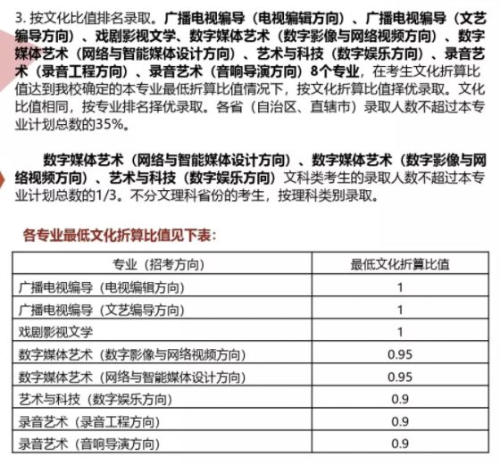 贯彻德、智、体、美、劳全面考核择优录取的原则,在考生政治思想品德考核和体检合格的情况下,考生文化折算分达到80分以上(含),按文化折算分排序择优录取,文化折算分并列的按专业成绩从高到低择优录取。影视摄影与制作专业(电视节目制作)、