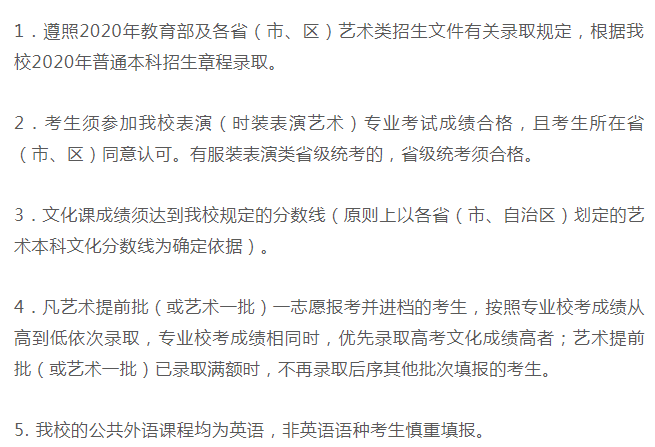 优先录取填报我校第一志愿并达到我校文化投档资格线的考生,录取填报批次为:艺术本科提前(一)批。录取时根据专业志愿按照校考服装表演类专业成绩排序录取。