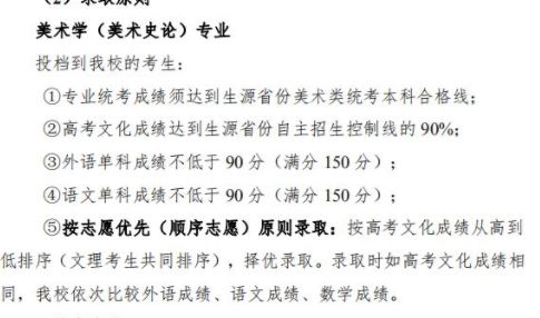 (2)“理论类”美术学专业:考生需参加各生源省美术术科统考,并取得合格证(未组织美术术科统考的省份除外),校考专业成绩(即参加《美术知识与作品赏析》科目考试成绩)和文化成绩达到我校规定的录取最低控制线,根据考生文化成绩从高到低,择优录取。优先录取第一专业志愿考生。如文化成绩相同,则文科生优先。同一省份,美术学专业录取人数总和最多不超过4人。