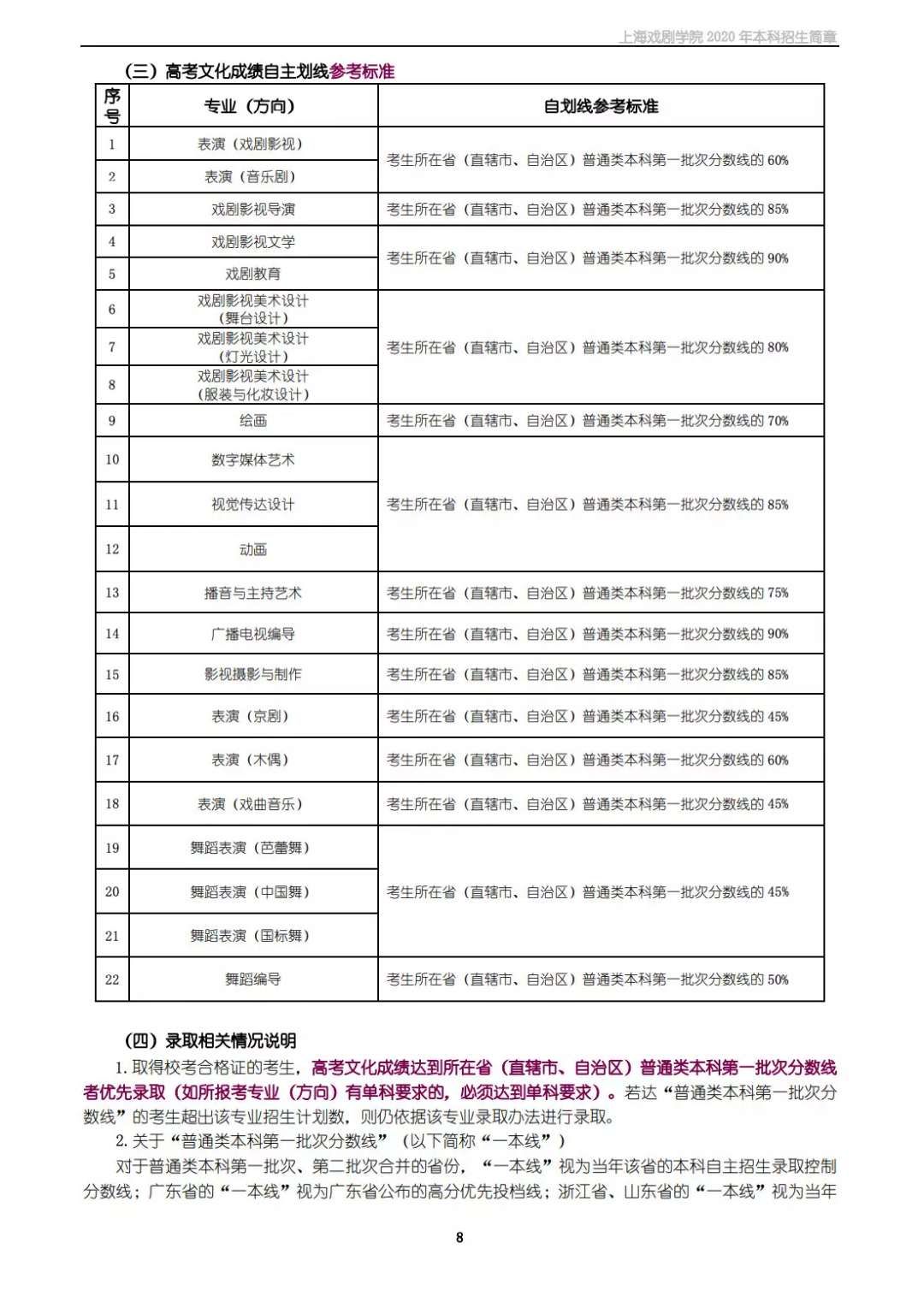 对于合并本科批次的省份,使用各省划定的自主招生参考线作为本科一批控制分数线(以下简称一本线)或按照考生所在省份的相关规定执行;广东一本线为广东省公布的高分优先投档线;浙江一本线为浙江省公布的普通类一段线。对于艺术类考生文化考试总分与普通类考生文化考试总分不一致的省份,一本线以该省给定的参考分数线为准。