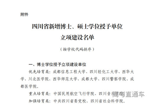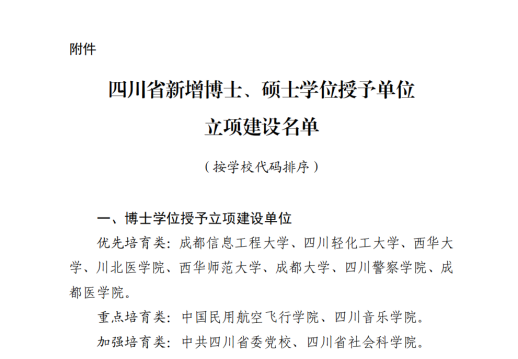 2023年12月,四川省人民政府学位委员会发布了《关于公布新增博士、硕士学位授予单位立项建设名单的通知》,8所高校获批纳入四川省博士学位授予立项建设“优先培育”类单位。其中,成都信息工程大学、西华师范大学2所高校,在本轮成功升格“博士学位授予单位”。