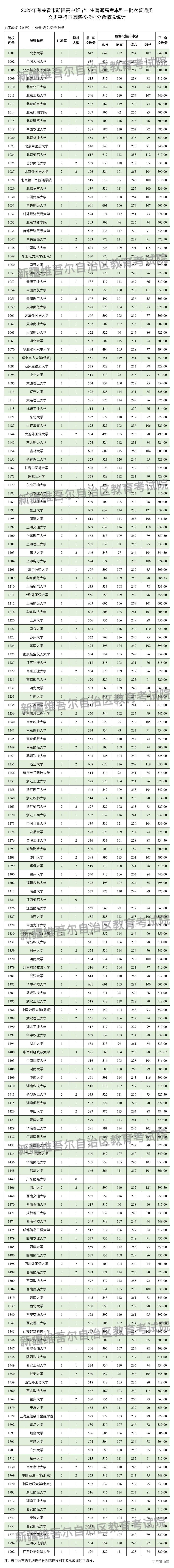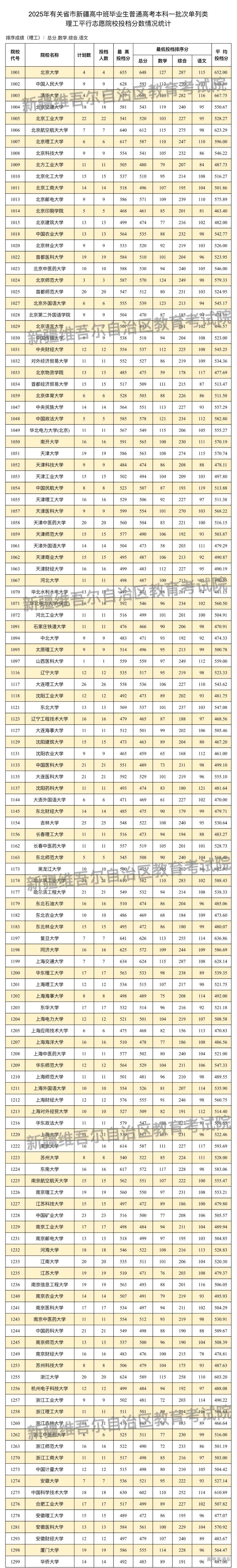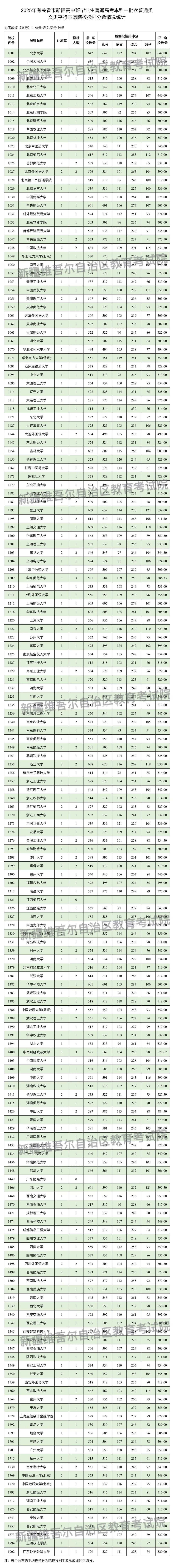 按照录取工作安排,自治区2025年普通高校招收有关省市新疆高中班毕业生本科一批次于7月25日正式投档录取,新疆教育考试院根据投档原则进行了投档,现将相关院校投档情况公布如下:
