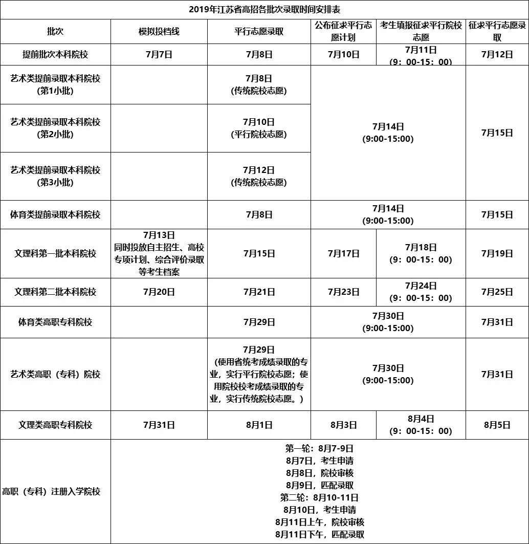 1、第一阶段志愿填报哪些人有资格填报? 文科类总分在267分以上、理科类总分在297分以上,方可填报第一阶段高考志愿,详情点开下方图片放大查看: 2、志愿填报之后可以进行修改么? 可以的,在7月2号17:00结束之前都可以进行修改,修改不限次数。但是每一次修改之后,必须要再次保存和提交。 3、踩线考生一本二本都要填么? 如果你是一本线上几分,我们建议一定要同时填报本二院校志愿; 如果你是一本线下几分,我们建议不要放弃填报本一院校志愿,可以选择不服从调剂,不被本一批次院校录取,不会影响到本二批次的志愿。 4、提前批不被录取会影响之后批次的录取吗? 完全不会,任何一个批次不被录取都不会影响到下个批次的录取。 5、要不要填专业服从调剂? 平行志愿建议一定要服从调剂,这样可以减少被退档的风险。 6、如果一本被录取了的话可以放弃一本,录取二本吗? 不可以。 7、平行志愿A志愿院校没被录取,到B志愿高校会降分录取么? 不会的,江苏省是平行志愿,A-H高校志愿都是平行的,依次检索。 8、平行志愿A志愿进档了,但是因为一些原因被退档了,还会再看B志愿吗? 不会,平行志愿是一档一投,一旦被某所院校调档了,就不会再看之后的院校志愿了。 9、平行志愿8个院校志愿分数都达到了,会被哪所院校录取? 平行志愿是从A~H这8所院校依次检索的,如果进了A院校,B院校即之后的志愿就不会再看了,如果未进A院校,会检索B院校志愿……依次类推。 10、高校按照105%提档,多出的5%会退档么? 服从专业调剂,符合高校其他体检或单科等要求,省内高校一般不会退档,省外的高校需自行咨询招办。 11、学校招生章程提到的等级级差和专业级差对考生有影响么? 有影响的,进档之后有的高校会在加上等级级差分或减掉专业级差分之后进行专业分配。 小招建议专业志愿也需要拉开梯度,不要都填报热门专业。等级较高的考生,可以多关注有等级级差的高校。 12、录取结果什么时候可以查询?在哪里查询? 2019年江苏高考录取时间汇总: 高招录取期间,家长和考生可以直接去江苏省教育考试院或者院校官网查询录取结果。 另外,如果未被该批次录取,一定要关注上表中的征平志愿的时间。 ◆ ◆ ◆ ◆ 小招提醒大家千万不要等到明天下午志愿填报截止时间之前再去填报和修改,以防遇到网络拥挤等突发状况!小招祝愿大家都能考上心仪的院校和专业!