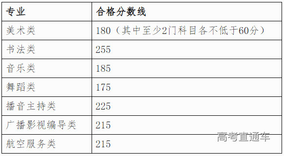 合格分数线作为专业合格分数,不分本专科,考生全区艺术统考成绩达到上述合格分数线(航空服务类专业同时还须专业体检合格)即为全区艺术统考合格生源。全区艺术统考成绩合格的考生,方可参加经我区同意的院校所举办的相应专业校考。