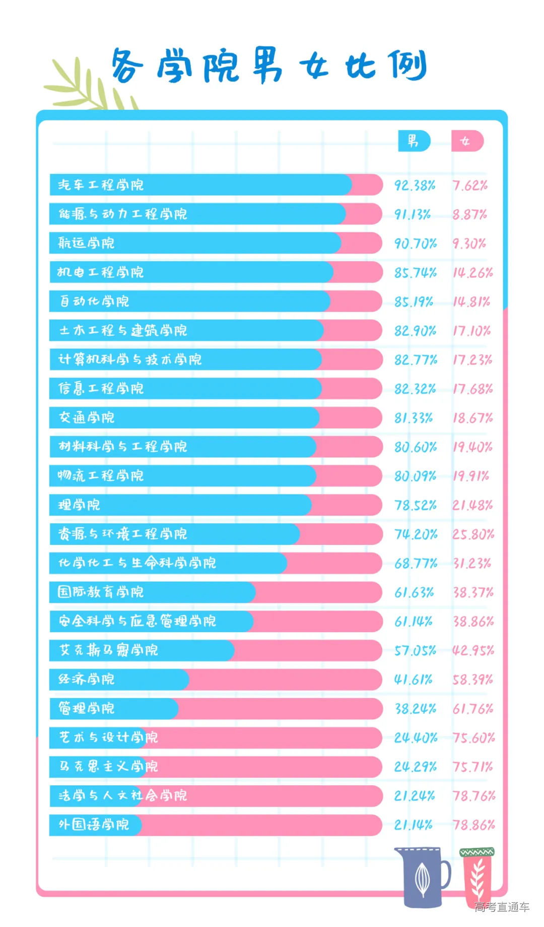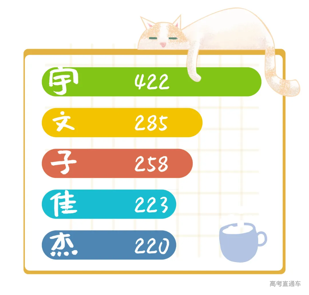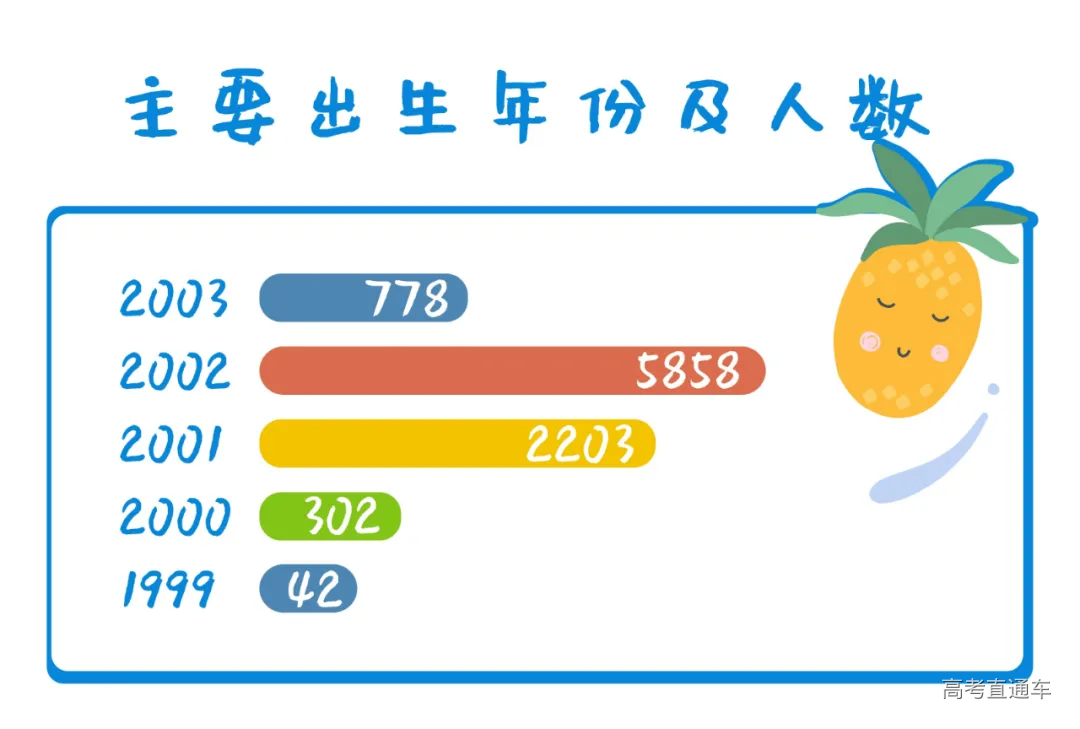 2020年录取的9241名新生中,男生6633人,女生2608人,男女比例默契地同往年保持一致。 虽然说整体男女比例基本不变 但各个学院男女比例参差有别 PS:可参考以下数据 并通过四年时间论证 男女比例与脱单比例间的关联程度 02 年龄分布:00后成为校园主力军 00后已是大学校园中的主力军,2020级新生中99.3%的为00后,部分90年代末尾的99/98年学生已经是这届同学中的大哥哥、大姐姐啦! 2002年(5858名)为常规入学年龄,属相是马。那么,我们来回忆一下,2002年,都发生了些什么?! 2002年,姚明成为NBA历史上第一位亚洲籍的新秀状元;张艺谋导演的《英雄》上映,桂纶镁在电影《蓝色大门》中饰演高中生孟克柔,《铁齿铜牙纪晓岚》才播到第二部;成年人的歌单里没准有那首“2002年的第一场雪,比以往时候来的更晚一些”,周杰伦也在2002年发行了《八度空间》专辑,“半兽人”“回到过去”“龙拳”没准现在都还在大家的歌单中。 44位同学在8月26日(处女座)出生,各位小伙伴可以约着吹生日蜡烛。 22个同学的生日是0527,和校庆日同一天。还有1个同学的生日是2000年5月27日,在武汉理工大学三校合并组建成立当天出生哦,看来与武理的缘分天注定嘛~ 03 姓名缘分:隔壁老“王”最常见 与2019级同学一致,今年的常见姓氏前七强仍是王、李、张、刘、陈、杨、周。恭喜王同学们连续两年荣登本科新生姓氏榜首,成为姓氏之“王”! “刘畅”同学请注意,请注意,你还有6位同名同姓同年级的有缘人也在报到现场,可以相约打卡图书馆哦~此外,还有5个“张鑫”“张驰”和4个“杨晨”“张鹏”“王涛”“刘洋”“陈俊”“陈鑫”同学们,可以下方留言寻找同名同姓小伙伴哟! 00后的家长们似乎偏爱“宇(422人)”“文(285)”“子(258)”“杰(220)”这四个字,连续两年重复率都位列姓名常用字前五,今年还有“佳(223)”挤掉“浩”,成功晋级前五强。 04 生源中学:高中到大学的“前缘再续” 2020级的同学从全国各地的2936所中学齐聚武汉理工大学求学,其中,这些中学的校友们队伍最为庞大。 05 民族分布:32个民族“相亲相爱是一家” 56个民族56朵花,2020年武汉理工大学就有32朵民族花加入本科生大家庭。 科普:今年还有7位“穿青人”,他们是主要分布在贵州西北地区,人员相对集中的“未识别民族”,人口总数量约六十七万人哦~