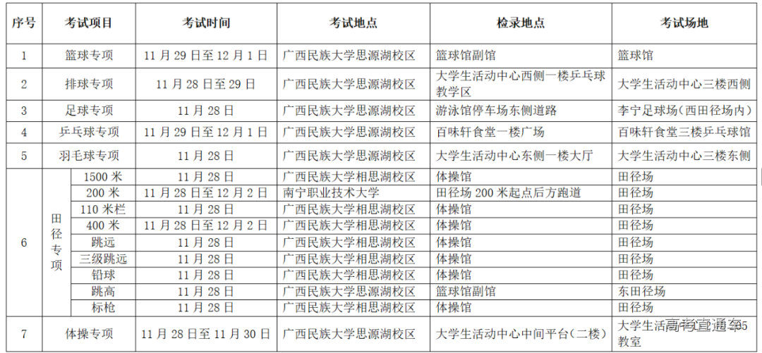 我区2026年普通高校招生体育类专业全区统一考试(以下简称体育统考)将于2025年11月28日至12月5日在广西民族大学和南宁职业技术大学考点举行,为确保广大考生安全顺利应考,共同营造公平、和谐、有序的考试环境,自治区招生考试院提醒广大考生、领队老师注意以下事项: