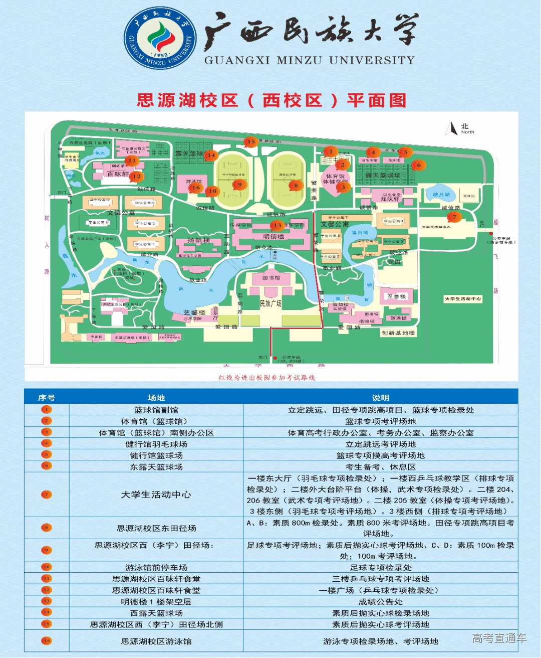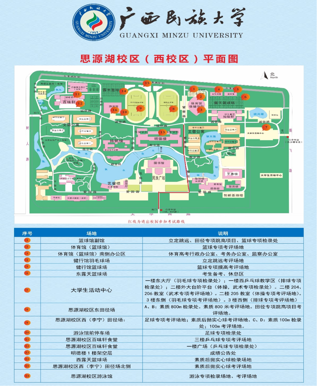 (一)广西民族大学思源湖校区(西校区),地址:南宁市大学西路158号。考试期间考生可凭《准考证》和身份证、领队老师凭工作证进入考点,仅可通过学校南门进出考点。