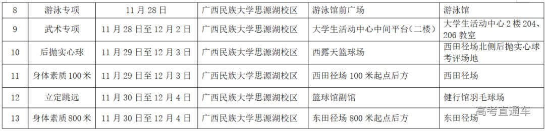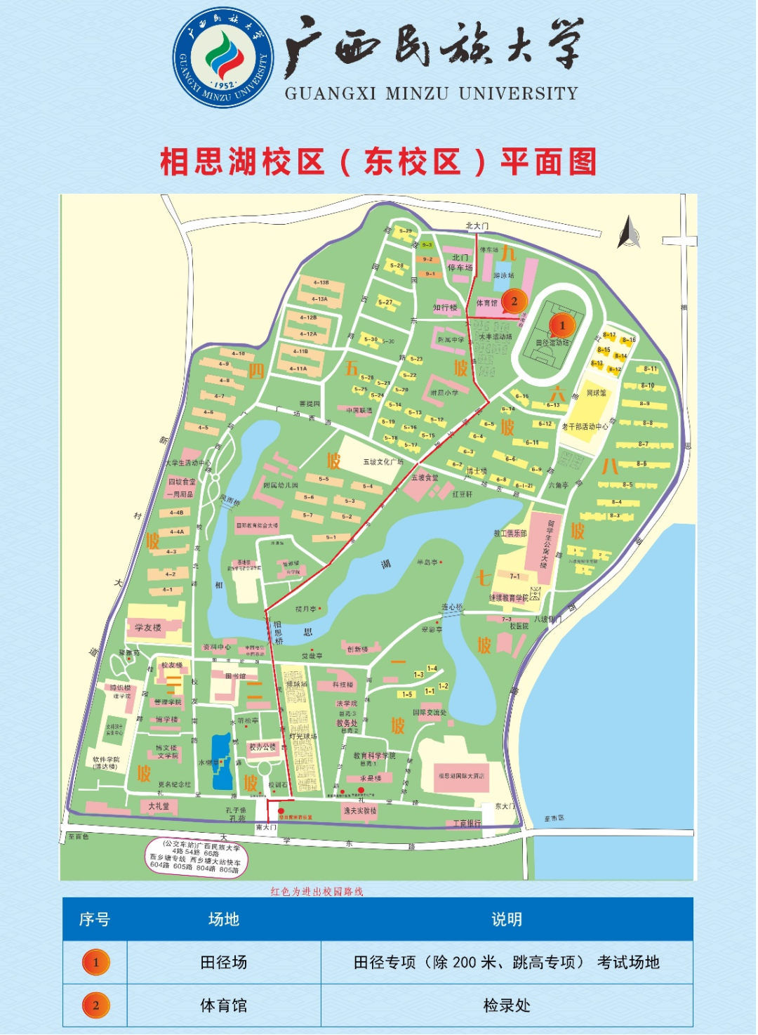 (二)广西民族大学相思湖校区(东校区),地址:南宁市大学东路188号。考试期间考生可凭《准考证》和身份证、领队老师凭工作证进入考点,可通过学校南门或北门进出考点。