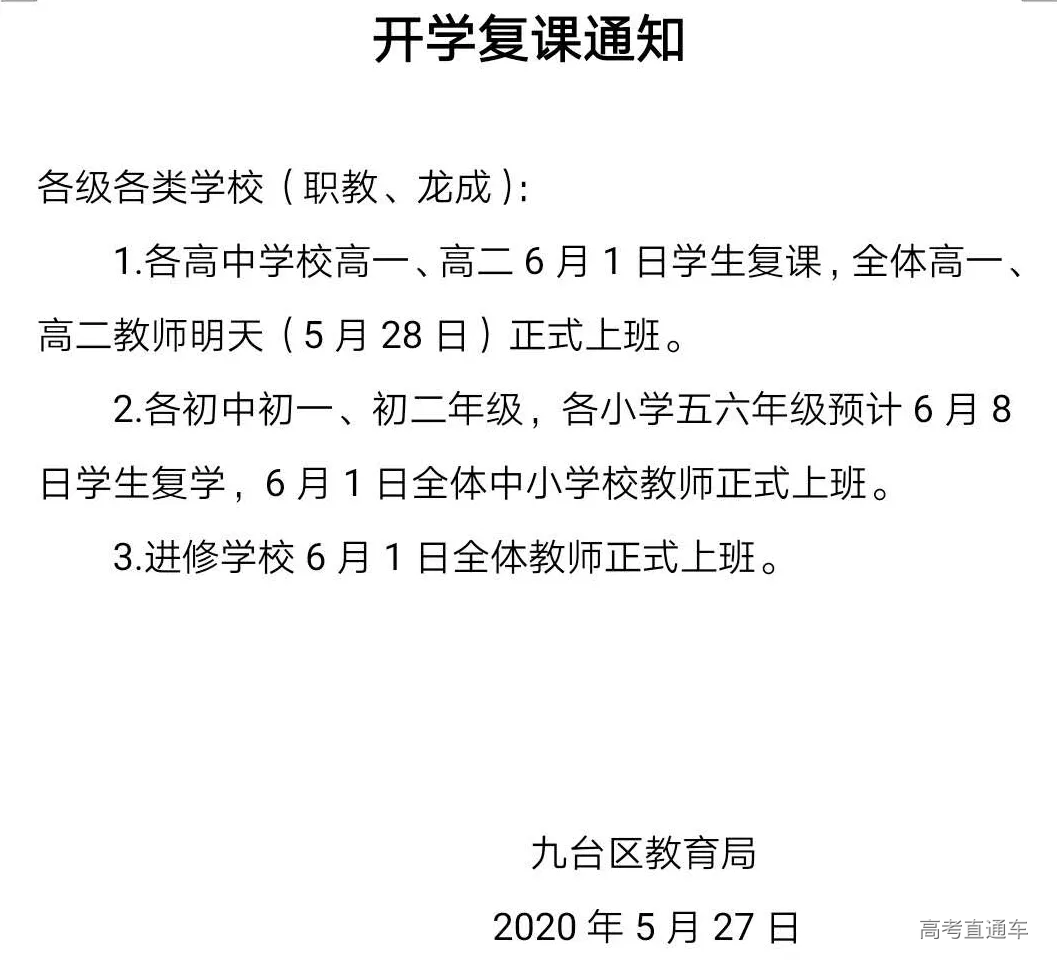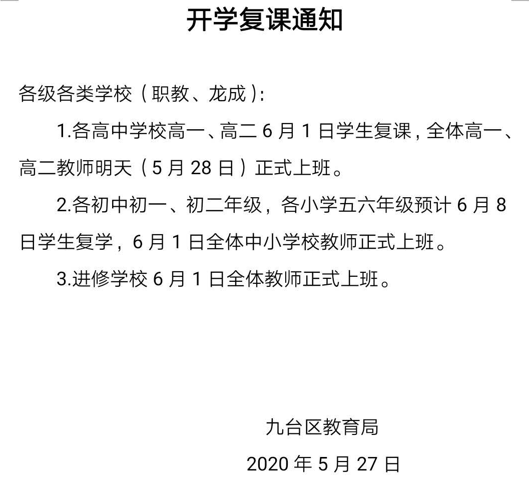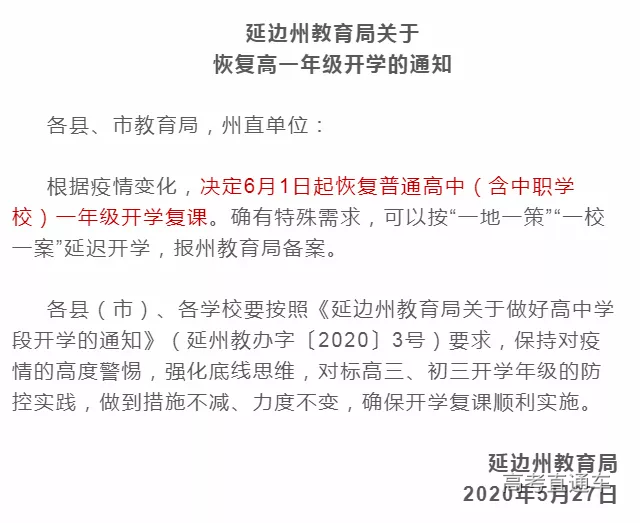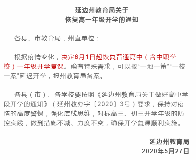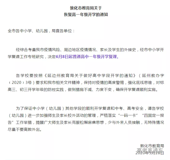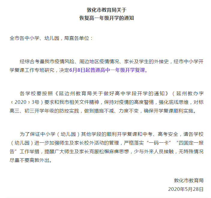 经综合考量敦化市疫情风险、周边地区疫情情况、家长及学生的外接史,经市中小学开学复课工作专班研究,决定6月8日起普通高中一年级开学复课。