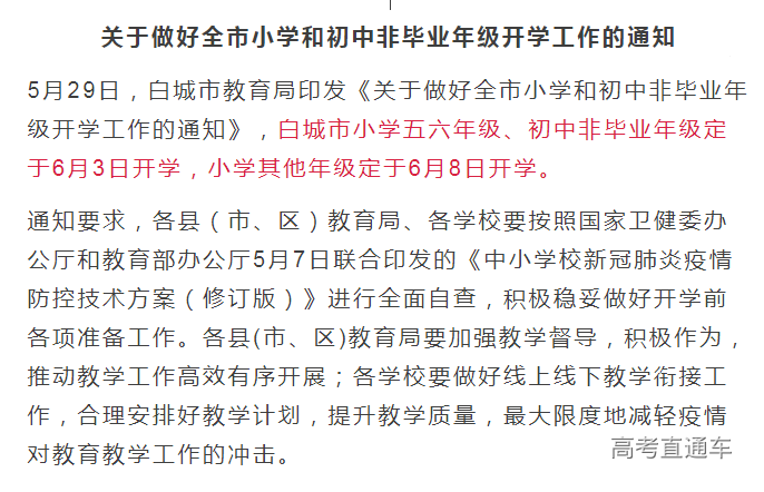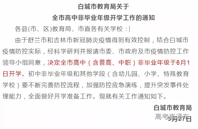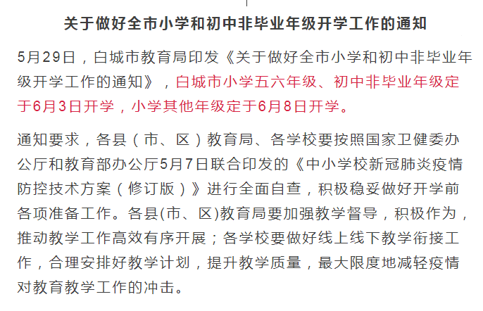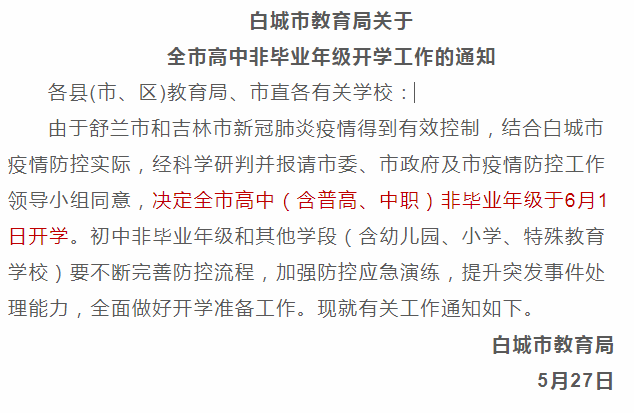 白城市小学五六年级、初中非毕业年级定于6月3日开学,小学其他年级定于6月8日开学。