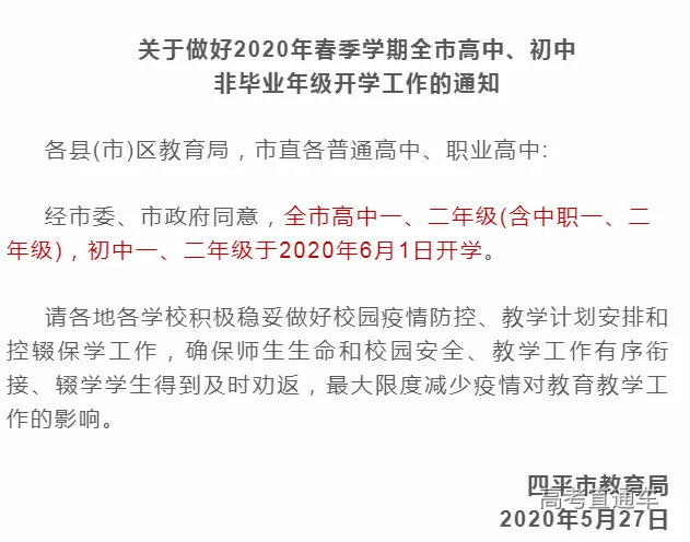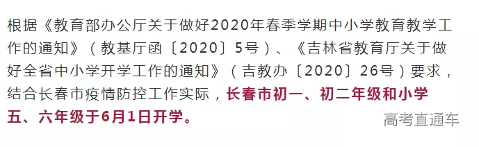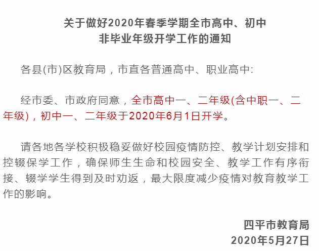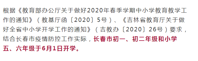 长春市 结合长春市疫情防控工作实际,长春市初一、初二年级和小学五、六年级于6月1日开学。 九台区 九台高一、高二年级6月1日开学,初一、初二年级,小学五六年级预计6月8日复学。 四平市 四平市原定于5月11日高一高二年级、初一初二年级开学,受舒兰、吉林等地疫情影响推迟开学;于5月27日发布高一高二年级、初一初二年级6月1日开学的通知。 延边州 延边州教育局于5月14日发布推迟5月18日高一年级的开学通知,于5月27日发布高一年级6月1日开学的通知。 白城市 白城市高一高二年级原定于5月18日开学,受舒兰、吉林等地疫情影响推迟开学,于5月27日发布高一、高二年级6月1日开学的通知。