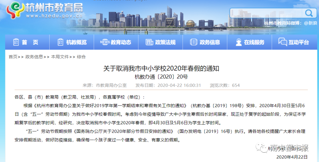 4月22日,浙江杭州市教育局官网消息,考虑到今年疫情导致广大中小学生寒假后长时间居家,现正处于复学的起始阶段,为保证本学期复学后的教学时间,经研究,决定取消杭州市中小学生2020年春假,即4月30日及5月6日为学生上学时间。4月23日,安徽马鞍山市教育局官方微博消息,因4月26日,初一、高一学生才刚刚返校,且大部分学生来自全省各地,为减少学生因来回路途乘坐公共交通而带来的疫情安全隐患,学校研究决定五一期间不放假。