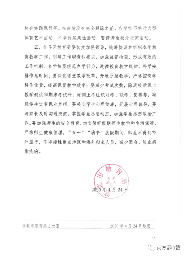 4月26日,安徽淮北市教育局官网刊发《关于2020年春季学期教学安排工作的通知》称,严格师生健康管理,“五一”“端午”放假期间,师生不得到市外旅行,不得接触重点地区和海外归来人员,减少聚会,防止感染疾病。安徽宣城市教体局4月24日通知称,为坚守校园安全防线,2020年“五一”5天假期总体要求是“不出市、不聚集”,全市中小学幼儿园教职员工和学生一律不得离开宣城市范围,不参加人员聚集性活动,减少与外人接触。4月26日,湖南株洲市教育局向全体师生及家长发出倡议,提醒大家要牢记“零报告非零风险”,“五一”假期非必要不离开本地。如因特殊情况必须外出,请提前了解目的地疫情风险等级,并严格按照要求,在返校前向学校提交相关健康证明材料。所有师生假期行程,必须如实向学校报告。另外,师生返校前,如有发热、咳嗽、乏力等异常情况,要暂缓返校,待治愈后凭医学诊断证明才能返校。26日,湖北宜昌市教育局提出,“五一”等法定节假日期间,要引导所有师生员工不出宜昌市域,需要离开的必须向学校报告活动轨迹,确保复学后师生员工安全返校。据河南日报客户端4月25日汇总,郑州市倡导“五一”假期期间不出市,确保复学后师生安全返校;高三、初三外地生原则上不离校。许昌市禁止学生“五一”假期期间跨地域流动。学校要与教职员工以及学生和家长签订“五一”假期期间不跨区域流动承诺。焦作市下发通知,对所有师生实行家校“点对点”闭环管理,“五一”假期期间,原则上不得离开焦作市辖区(含六县市)。